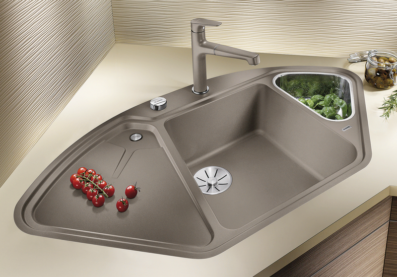 Кухонная угловая функциональная мойка, для монтажа в один уровень со столешницей и шириной шкафа 80 см, черного цвета из материала SILGRANIT® PuraDur® искуственного камня с клапаном-автоматом.
