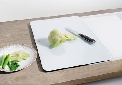 - Скользящая стеклянная разделочная доска или разделочный столик из ясеня позволяют сбрасывать нарезанные продукты непосредственно в посуду.
