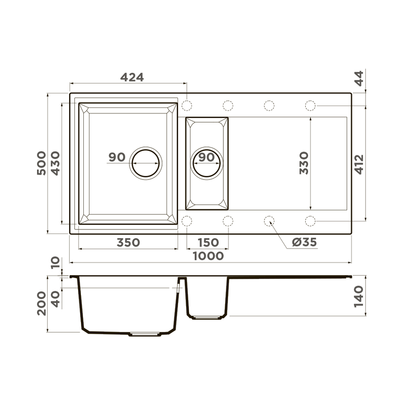 - Размер чаши: 350 x 430 / 150 x 330 мм