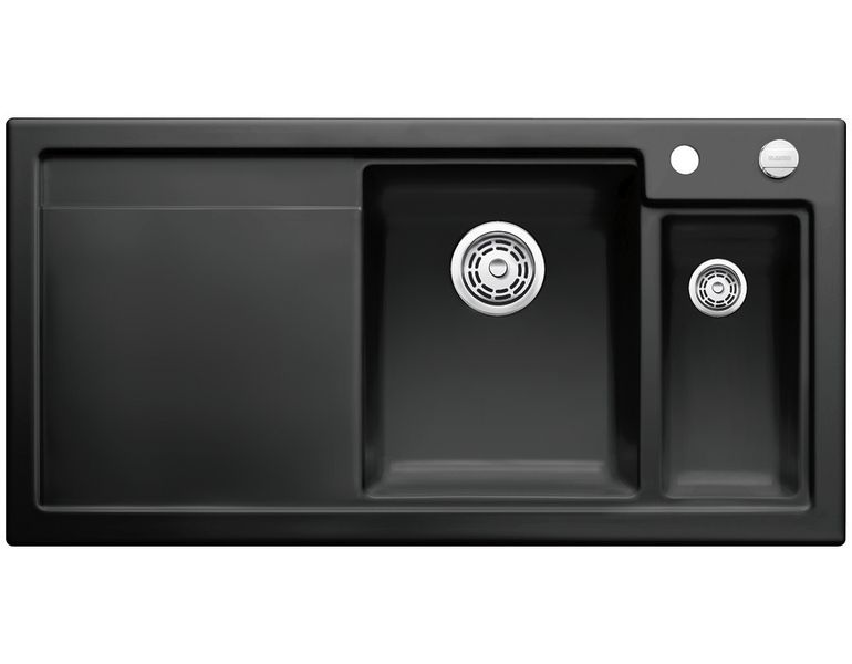 Кухонная функциональная мойка с врезным монтажем, для шкафа шириной 60 см черного цвета из материала керамика BLANCO PuraPlus™ с клапаном-автоматом.