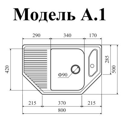 Гранитная мойка A.1 – компактная угловая модель с глубиной чаши 16 см, удобным крылом и необычным расположением переливного отверстия.