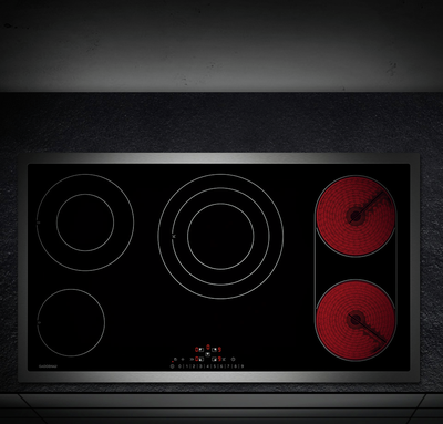 Стеклокерамическая варочная панель шириной 90 см, с рамкой из нержавеющей стали.