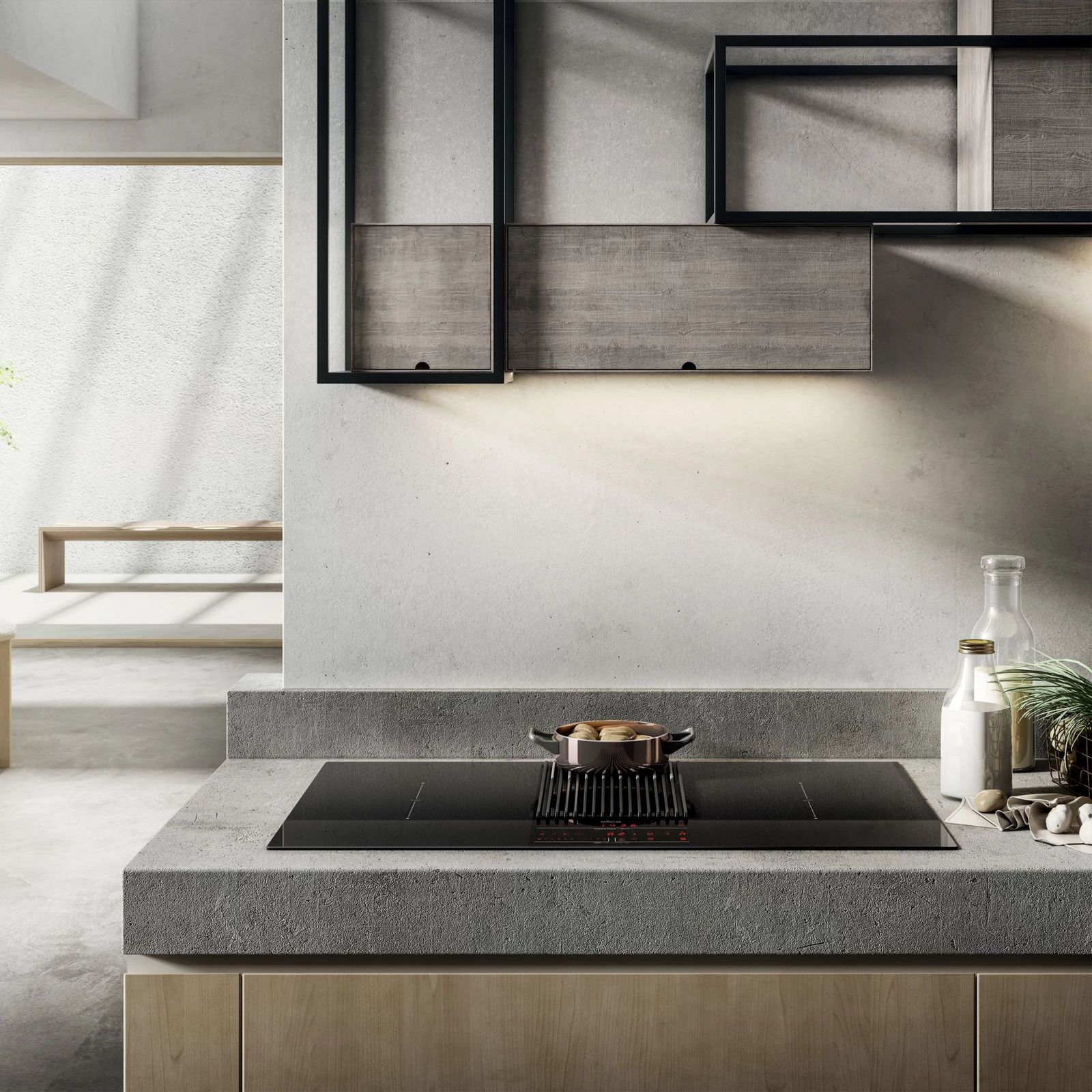 Дозируйте, взвешивайте, готовьте, не двигаясь с места! Наконец-то вы можете готовить, ни на шаг не отдаляясь от плиты: ингредиенты можно взвешивать прямо на варочной панели, со всеми удобными функциями тарирования, прогрессивного взвешивания или памяти. Все делается просто, благодаря интуитивно понятному интерфейсу, который очень легко настраивается. Варочные зоны гибки и эргономичны: варочная панель оснащена функцией, которая позволяет объединить две варочные зоны (справа или слева), обеспечивая равномерную мощность и температуру даже для больших кастрюль. Встроенная система аспирации очищает воздух от испарений и неприятных запахов автоматически, благодаря комбинированному фильтру против жира, запаха и влаги, который гарантирует максимальную эффективность работы изделия и простоту его обслуживания.