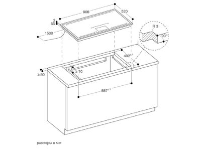 - Общая ширина может изменяться в пределах допустимых отклонений и в зависимости от выреза столешницы.