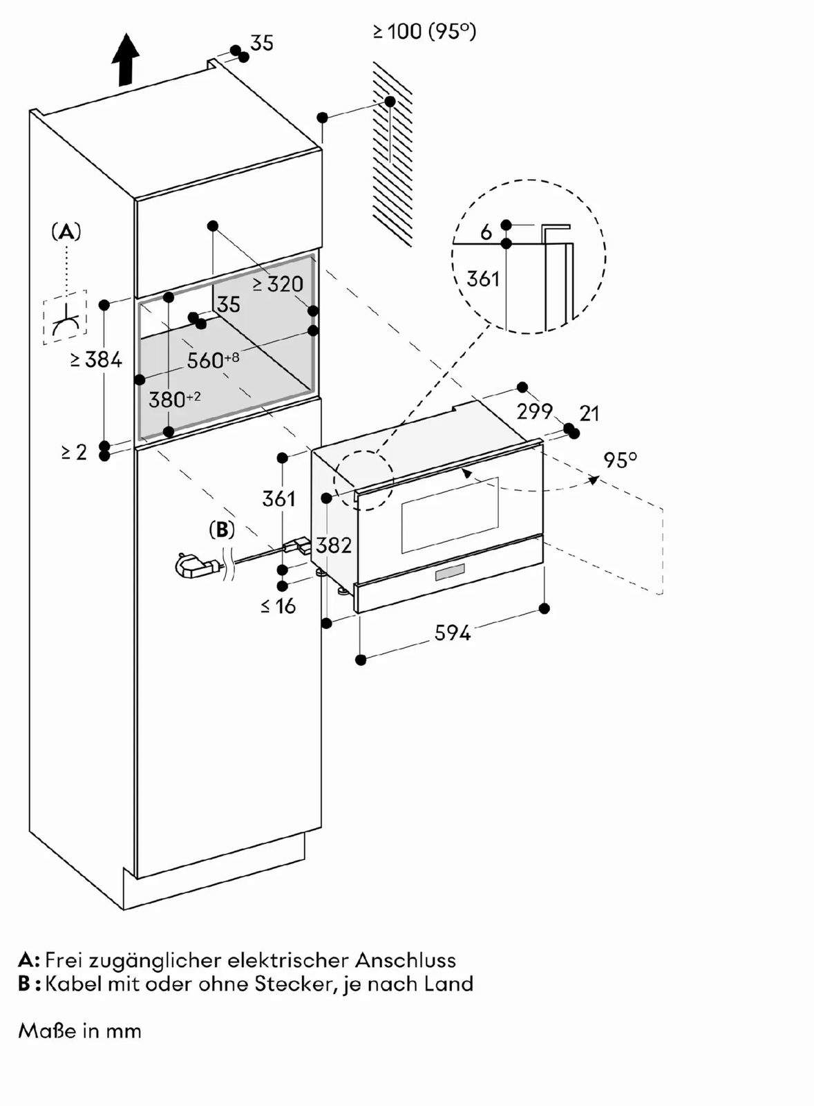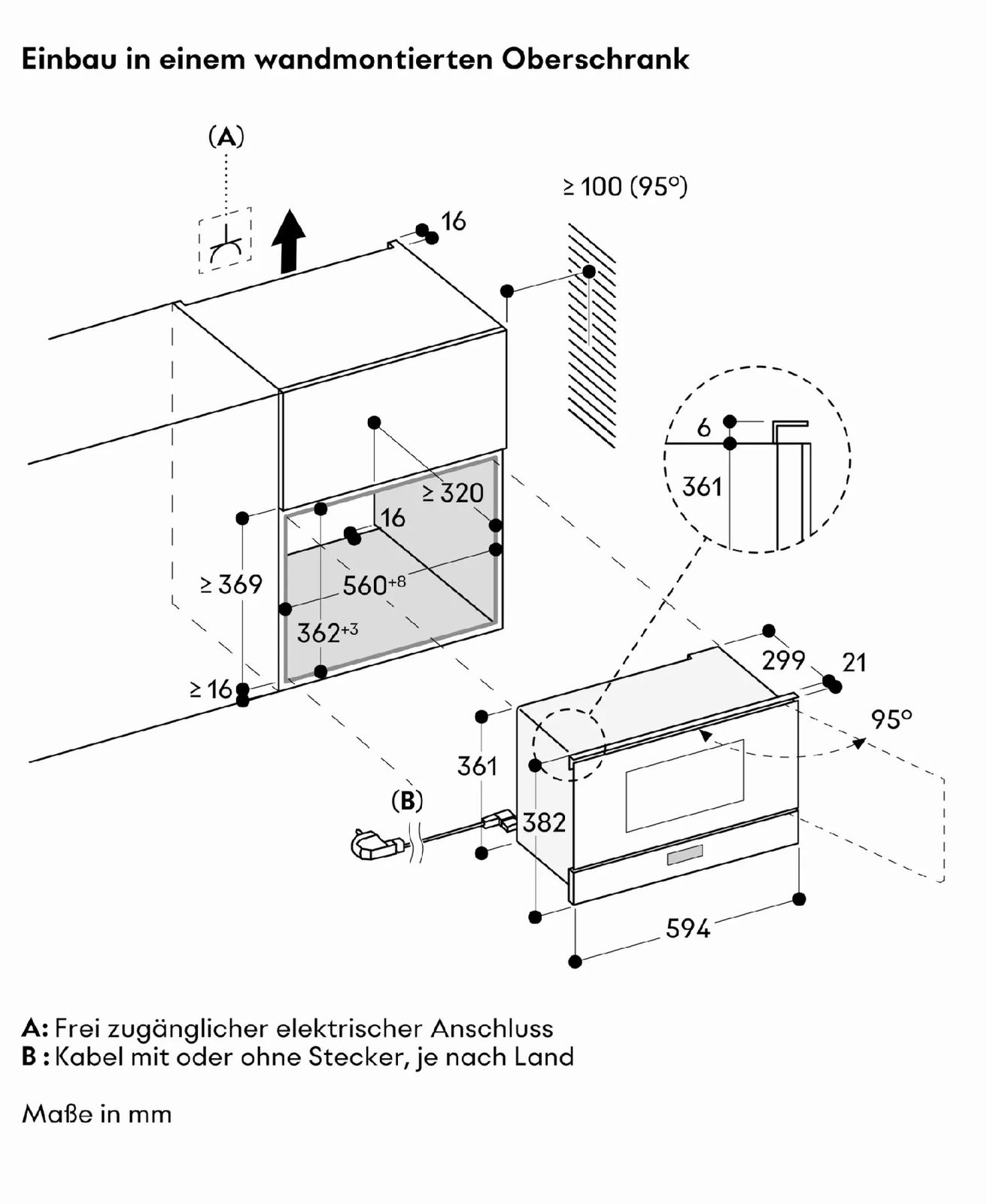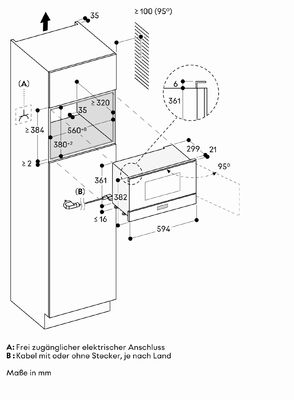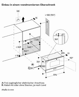 Размеры прибора (В × Ш × Г): 454 × 595 × 525 мм (Mindesteinbauhöhe 85 см от верхнего края ниши)