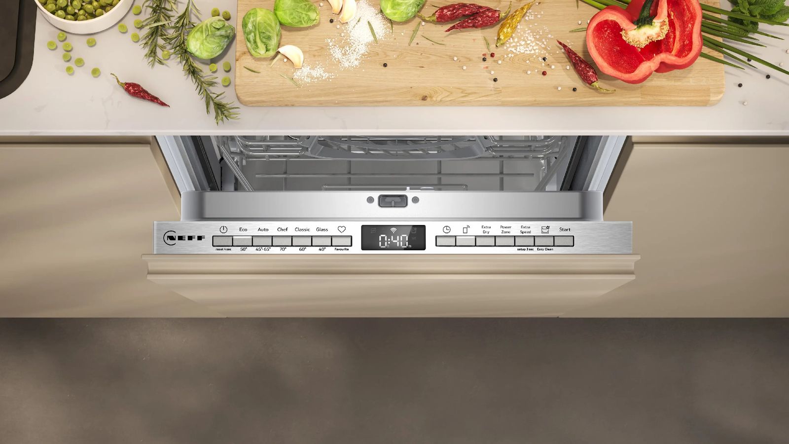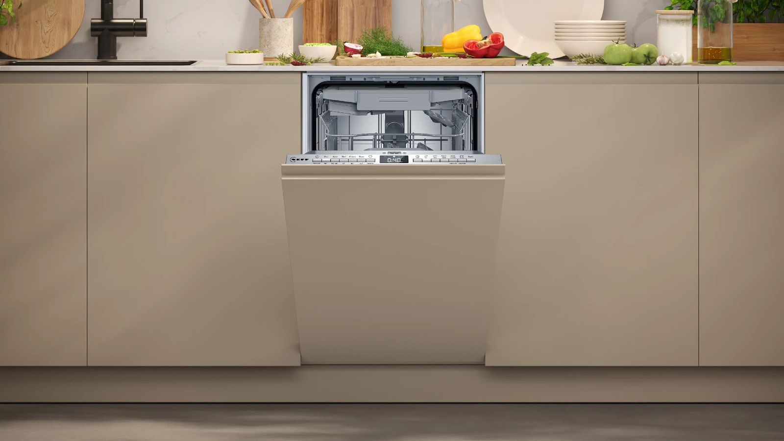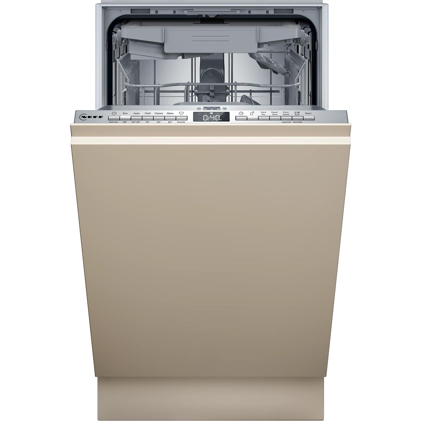 Полностью встраиваемая посудомоечная машина NEFF N 50. Ширина — 45 см. Тип — встраиваемая. Цвет не применим, так как скрывается фасадом мебели.