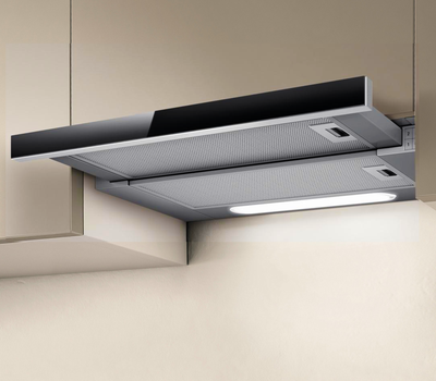 Встраиваемая вытяжка в шкаф, шириной 60 см. серая с черным стеклом.