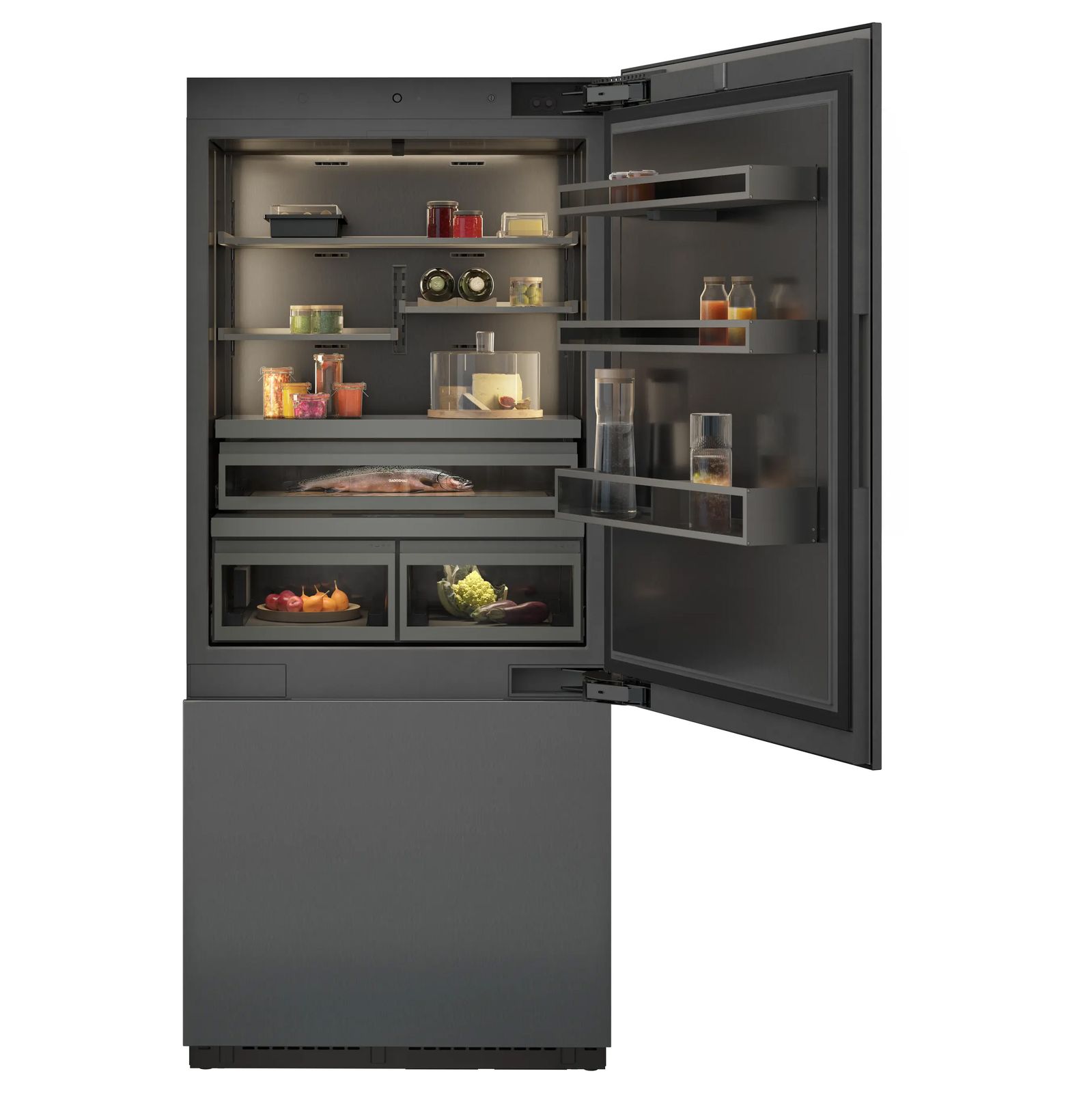 Гибкое позиционирование полок на дверце благодаря незаметной системе подвески.