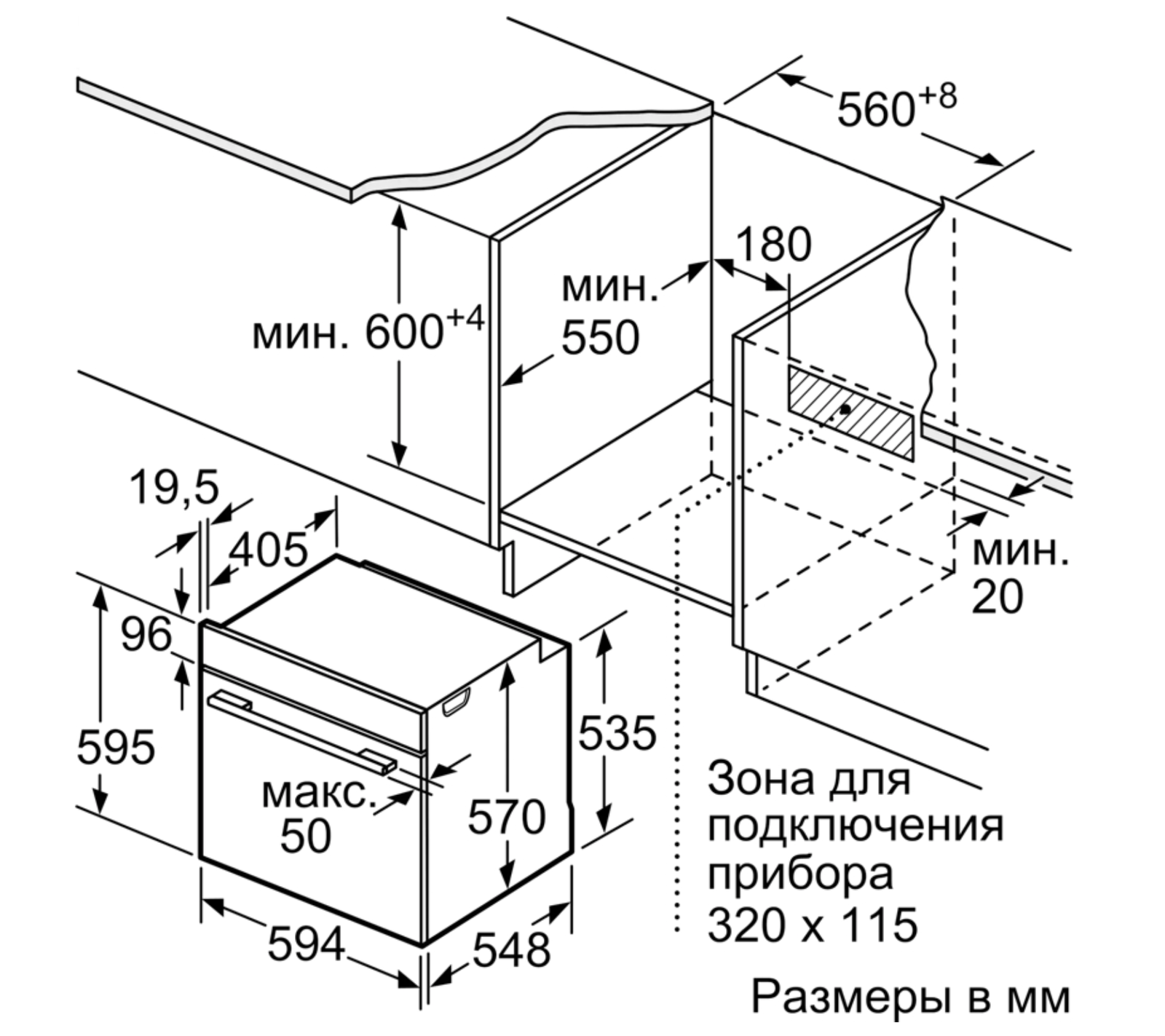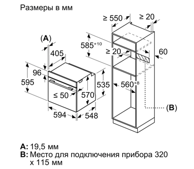 - Размеры ниши для встраивания (ВхШхГ): 575 мм - 597 мм x 560 мм - 568 мм x 550 мм