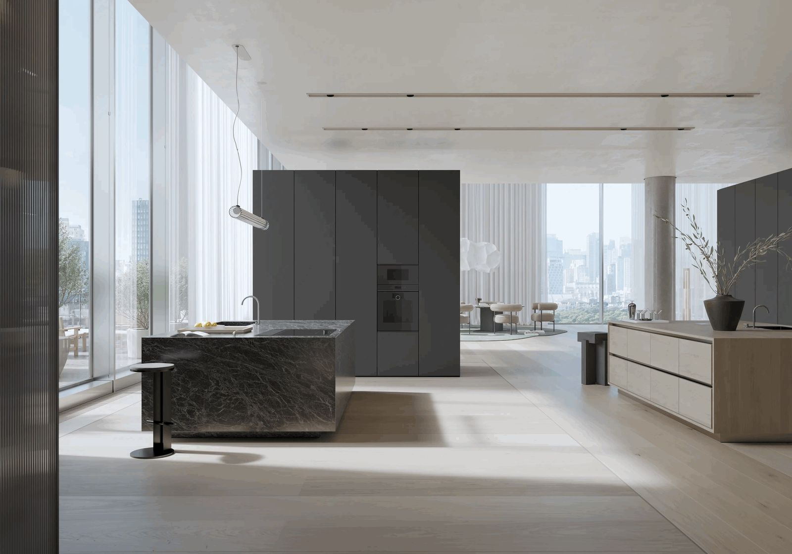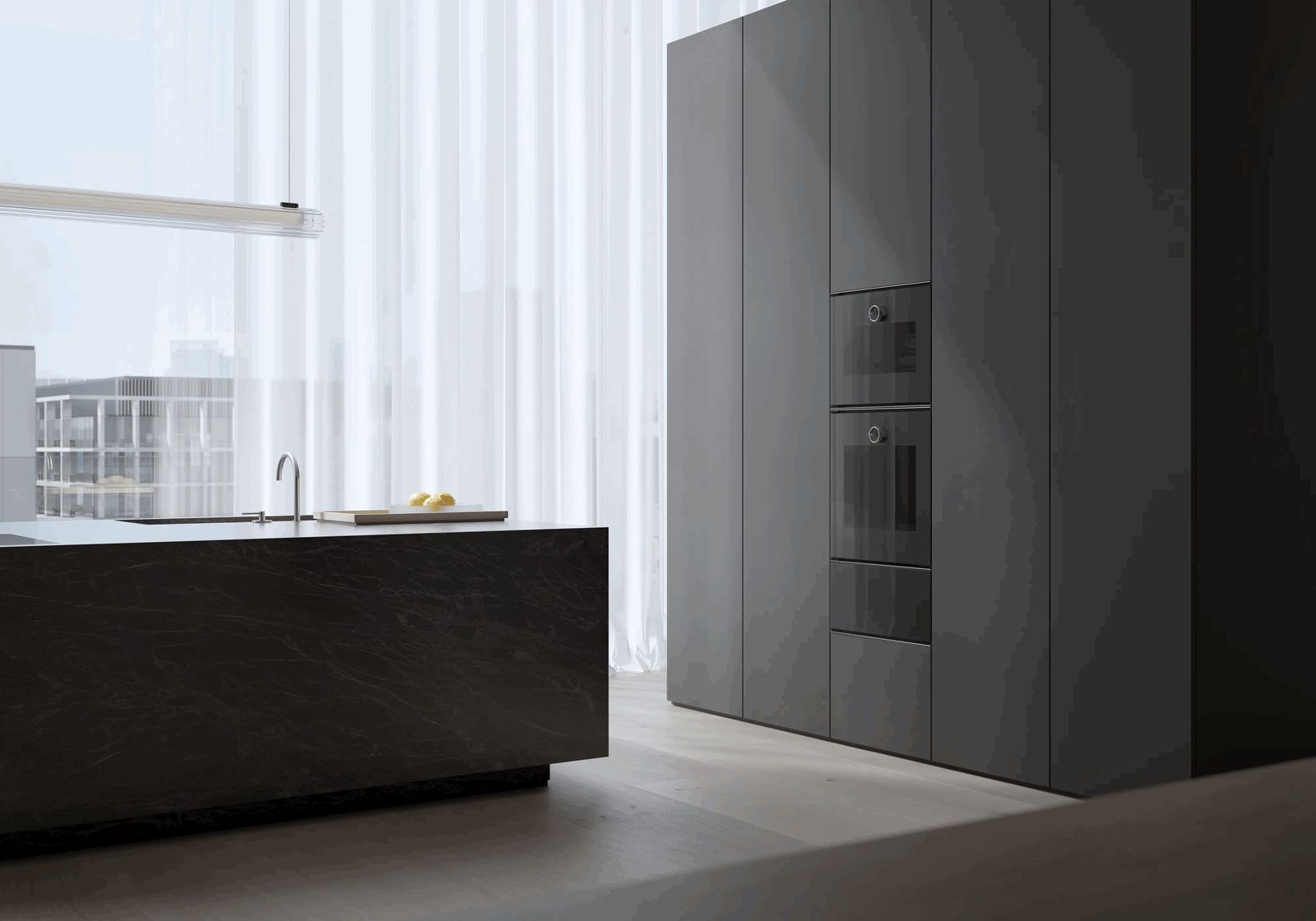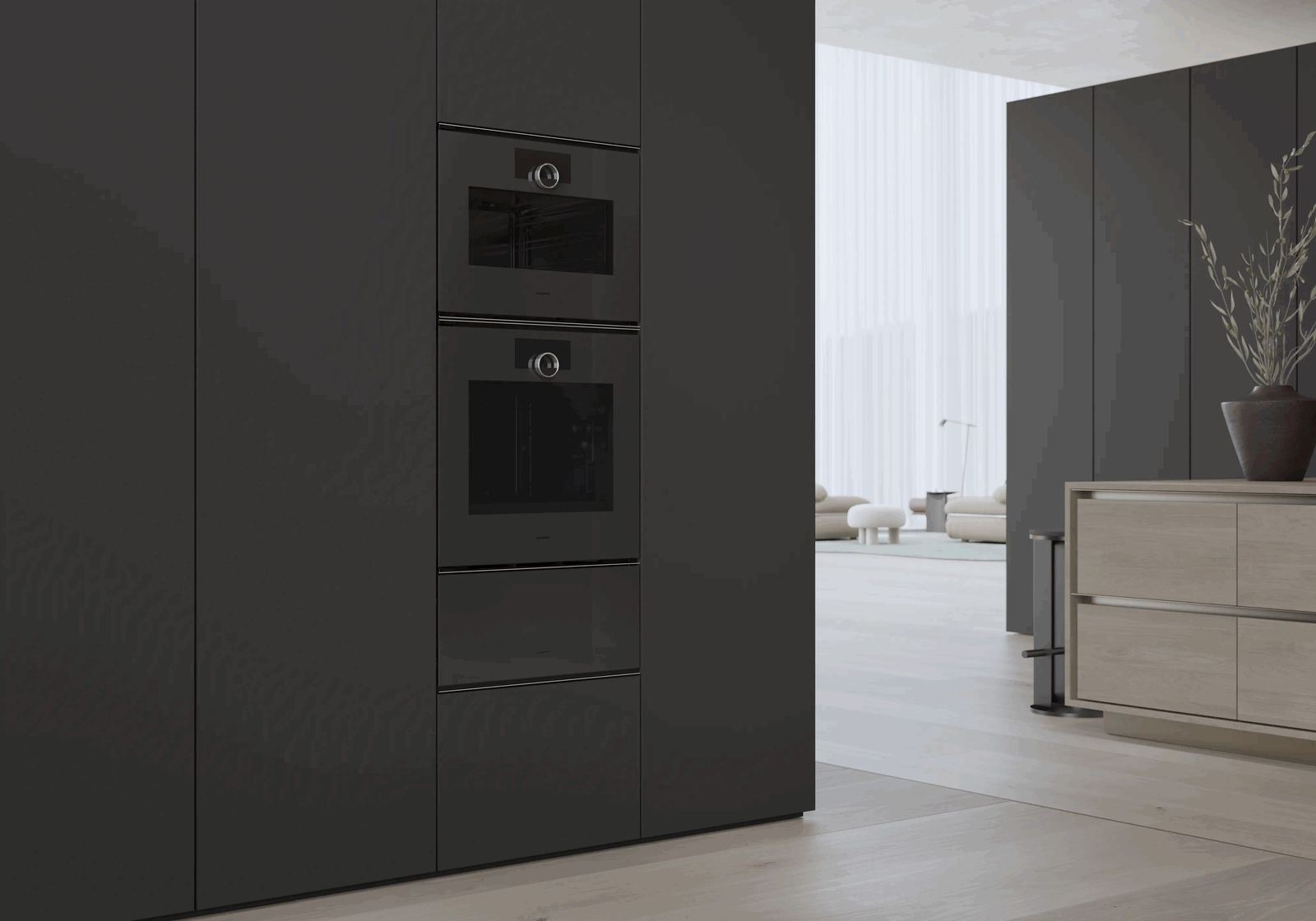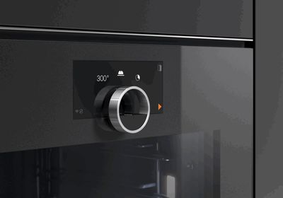 Духовой шкаф Gaggenau Serie Minimalistic. Встраиваемый заподлицо (flächenbündiger Einbau). Безрамная цельностеклянная дверь с электронным открыванием (grifflose Vollglastür mit elektronischer Türöffnung). Full-Touch-Display с поворотным кольцом из нержавеющей стали (Edelstahl-Bedienring). Дверь открывается вправо (Türanschlag: rechts), угол открывания 110° (может быть уменьшен до 92° при необходимости), направление не меняется. Термоизолированная дверь с пятерным остеклением (Fünffach-Verglasung).