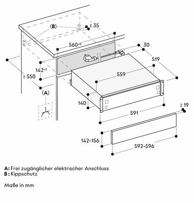 Боковой зазор между фасадом прибора и фасадом мебели мин. 5 мм.